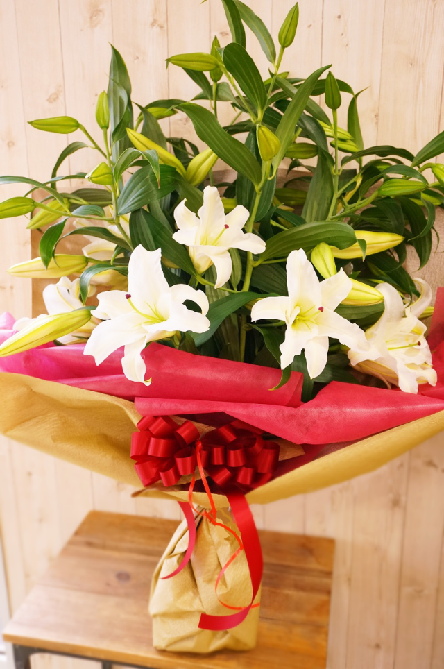 TOP花束 店舗受取OK カサブランカの花束 価格: ¥11,000 (税抜 ¥10,000) 販売期間: 数量: 束 在庫: 在庫あり 在庫 在庫あり 返品についての詳細はこちら 純白で大輪の花を咲かせる抜群の豪華さ! 茎はがっしりとしていて、花びらや葉はとても上品です。花持ちも良いので長くお楽しみ頂くことができます。 ※入荷のタイミングでつぼみが多くなる場合がございますので、ご了承頂けます様お願い致します。